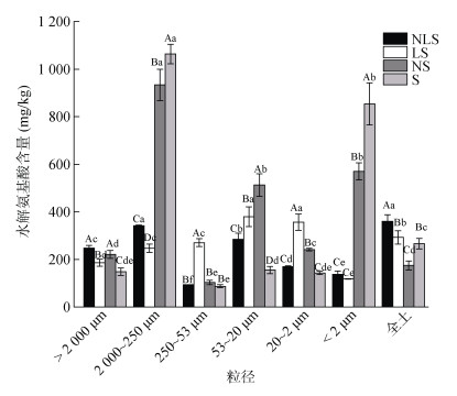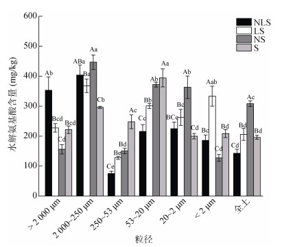 图 4 不同处理条件下阔叶林土壤物理组分水解氨基酸含量 Fig. 4 Hydrolyzed amino acid contents of soils and different size fractions in broad-leaved forest under different treatments |