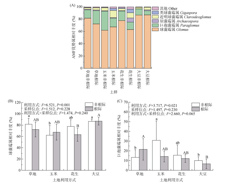 2 结果与分析 2.1 酸性红壤AMF群落优势属如图1A所示,所调查的酸性红壤样品中AMF群落优势属(相对丰度>1%)包括:球囊霉属(Glomus,62.1% ~ 86.7%)、巨孢囊霉属(Paraglomus,6.0% ~ 30.1%)、原囊霉属(Archaeospora,0.2% ~ 6.7%)、近明球囊霉属(Claroideoglomus,2.2% ~ 11.4%)和类球囊霉属(Gigaspora,0.1% ~ 3.4%)。本文重点分析了土地利用方式和根际作用(采样点位)对球囊霉属和巨孢囊霉属的影响,发现土地利用方式显著影响其相对丰度(P<0.05),但是根际作用影响并不显著(图1B和1C)。草地和大豆地非根际土壤球囊霉属的相对丰度明显高于玉米地(P<0.05),而大豆地根际球囊霉属的相对丰度明显高于花生地根际(P<0.05) (图1B)。玉米地非根际土壤巨孢囊霉属的相对丰度显著高于草地和大豆地(P<0.05),而大豆地根际土壤巨孢囊霉属的相对丰度显著低于草地(P<0.05) (图1C)。