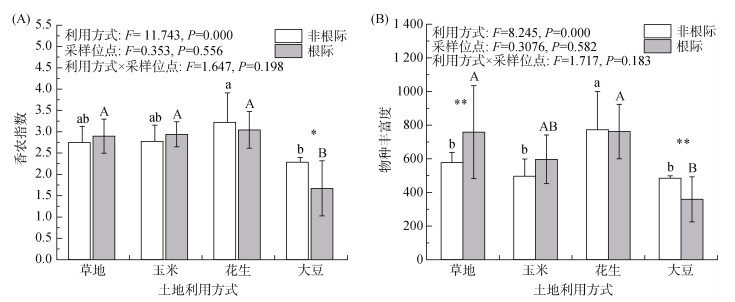 1.4 数据分析使用软件SPSS 20.0进行统计学分析。采用双向方差分析(ANOVA)检验土地利用方式和采样点位(根际和非根际)对AMF群落优势属相对丰度和α多样性的影响。如果差异具有统计学意义(P<0.05),再使用单因素方差分析或T检验进行差异比较。采用Pearson法进行相关性分析。