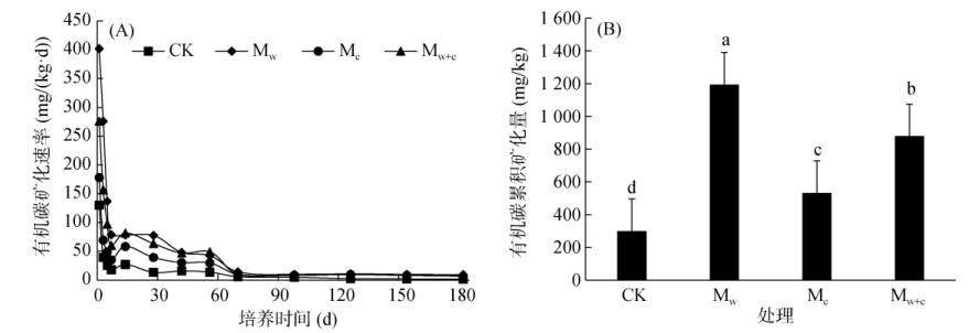 2 结果与分析 2.1 有机覆盖对土壤有机碳矿化的影响由图 1A可知,有机覆盖显著影响了土壤有机碳矿化速率,覆盖处理有机碳矿化速率均显著高于CK(P < 0.05),各处理均呈现随培养时间的延长而下降,最终逐渐趋于平缓的趋势。培养初期(1 ~ 7 d),矿化速率下降最快,第1天矿化速率最大,为130 ~ 402 mg/(kg·d);培养中期(7 ~ 70 d),第7 ~ 14天,矿化速率略有升高,第14 ~ 70天逐渐小幅度下降;末期(70 ~ 182 d)矿化速率趋于平稳,第182天的矿化速率为第1天的1.25% ~ 3.91%。有机覆盖处理有机碳累积矿化量显著高于CK(P < 0.05,图 1B),其中Mw处理的有机碳累积矿化量最高,是CK的3.98倍,Mc和Mw+c处理分别是CK的1.77倍和2.93倍。