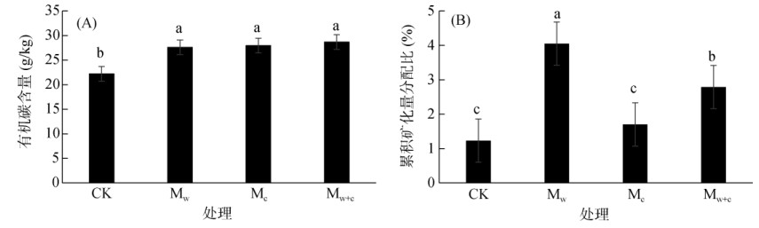 不同处理土壤有机碳含量变化如图 2A所示,覆盖处理的SOC含量显著高于CK(P < 0.05),而不同覆盖模式的SOC含量差异不显著,Mw+c处理的SOC最高,比CK提高了29.14%,Mw和Mc的SOC分别比CK提高了24.37% 和25.90%。土壤有机碳累积矿化量分配比是指在一定时间内土壤有机碳累积矿化量占土壤有机碳含量的比例,能在一定程度上反映土壤有机碳的固碳能力[25]。Mw处理有机碳累积矿化量分配比显著高于其他处理(P < 0.05),Mw+c处理土壤显著高于Mc和CK处理,而Mc处理与CK无显著差异(图 2B)。这说明不同有机覆盖模式下,Mw处理的土壤固碳能力最差,Mc的土壤固碳能力最好。