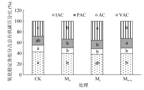 氧化稳定组分占总有机碳比例如图 3所示,VAC组分占比最高,为38.03% ~ 42.58%,AC组分占比为10.28% ~ 12.48%,这两个组分均表现为CK占比最高,说明有机覆盖降低了土壤有机碳活性组分的比例。同时,有机覆盖后增加了稳定组分的比例,具体表现为:PAC组分占比为15.90% ~ 17.92%,Mw+c处理占比最高,CK处理与其他处理差异不显著;IAC组分占比为28.11% ~ 35.77%,Mc、Mw+c、Mw处理均显著高于CK(P < 0.05)。