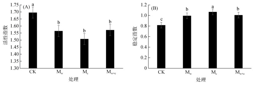 有机碳活性指数的变化范围为1.51 ~ 1.70(图 4A),覆盖土壤的活性指数显著低于CK(P < 0.05),而不同覆盖处理间差异不显著,具体表现为CK > Mw+c > Mw > Mc。稳定指数的变化范围为0.82 ~ 1.07(图 4B),覆盖土壤的稳定指数显著高于CK(P < 0.05);不同覆盖处理间,Mc和Mw+c处理的稳定指数显著高于Mw处理,具体表现为Mc > Mw+c > Mw > CK。与CK相比,覆盖处理的活性指数下降了7.65% ~ 11.18%,稳定指数则上升了20.73% ~ 30.49%。