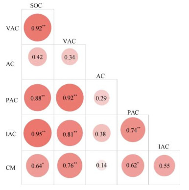 (CM:累积矿化量,SOC:总有机碳,VAC:高氧化活性有机碳组分,AC:中氧化活性有机碳组分,PAC:低氧化活性有机碳组分,IAC:稳定有机碳组分;圆圈中数字为相关系数,* 表示显著相关(P < 0.05),**表示极显著相关(P < 0.01)) 图 5 有机碳累积矿化量与土壤有机碳及氧化稳定组分的相关性 Fig. 5 Correlation of SOC cumulative amount with SOC and its oxidation stability fractions |