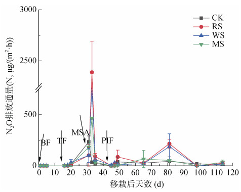 (BF:基肥,TF:分蘖肥,PIF:穗肥,MSA:烤田期;下同) 图 1 水稻生长期N2O排放通量的变化 Fig. 1 Variation in N2O emission flux during rice growing season |