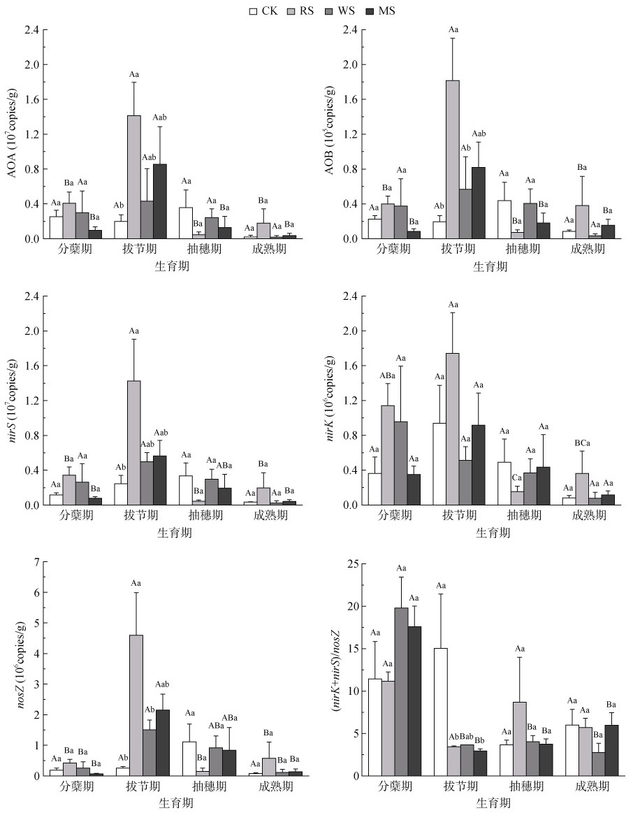(图中不同大写字母表示同一处理不同时期间差异显著(P < 0.05),不同小写字母表示同一时期不同处理间差异显著(P < 0.05),下同) 图 2 水稻生长期土壤氨氧化菌(AOA和AOB)和反硝化菌(nirS/nirK/nosZ)的群落丰度 Fig. 2 Abundances of ammonia-oxidizing bacteria and ammonia oxidizing archaea (AOA and AOB) and denitrifiers (nirS/nirK/nosZ) during rice growing season |