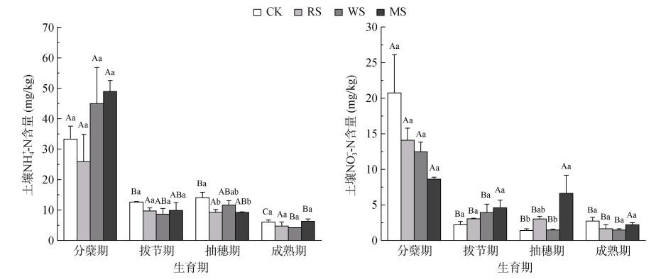 图 3表明,本研究中土壤NH4+-N和NO3–-N含量均随水稻生长呈下降趋势,且NH4+-N含量整体高于NO3–-N含量。CK、RS、WS、MS处理下,土壤NH4+-N含量随生育期变化的极差分别为27.26、21.11、40.75、42.60 mg/kg;土壤NO3–-N含量的极差分别为19.32、12.41、11.00、6.43 mg/kg。不同生育期间比较,各处理下土壤NH4+-N和NO3–-N含量均在分蘖期达到峰值,其中CK处理分蘖期土壤NH4+-N含量显著高于其他3个生育期;RS处理各生育期之间土壤NH4+-N含量没有显著性差异;而WS和MS处理下,分蘖期土壤NH4+-N含量仅显著高于成熟期;除MS处理外,其余处理分蘖期土壤NO3–-N含量均显著高于其他3个生育期(P < 0.05)。不同处理间比较,抽穗期CK处理的土壤NH4+-N含量显著高于RS和MS处理(P < 0.05),抽穗期MS处理的土壤硝态氮含量显著高于CK和WS处理(P < 0.05),其他生育期内各处理之间均无显著性差异。