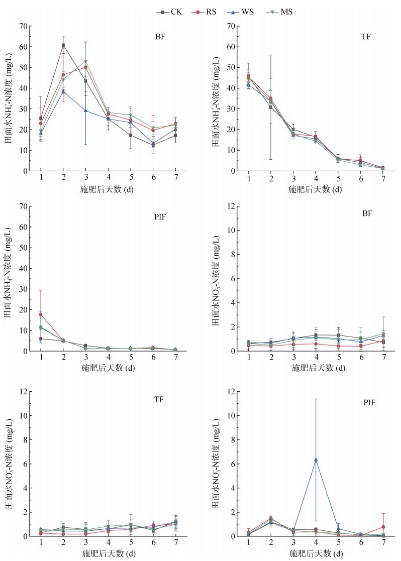 如图 4所示,田面水NH4+-N浓度整体明显高于NO3–-N浓度。各个处理3个肥期田面水NH4+-N浓度变化趋势基本一致。水稻基肥期,1 ~ 4 d田面水NH4+-N浓度先大幅升高后迅速下降,且各个处理间峰值出现的时间存在差异,4 ~ 7 d内呈现先下降后升高趋势,变化幅度较上个时期小。水稻蘖肥期,田面水NH4+-N浓度每日以不同速率急剧下降。水稻穗肥期,NH4+-N浓度总体呈现下降趋势,变化速率先急后缓,其中1 ~ 4 d下降速率较快,4 ~ 7 d基本保持稳定。各个处理3个肥期田面水NO3–-N浓度变化趋势亦较为一致。水稻基肥期,1 ~ 2 d内各处理田面水NO3–-N浓度几乎没有增长,在2 ~ 4 d逐渐升高到达峰值,4 ~ 6 d缓慢下降,6 ~ 7 d内CK处理浓度下降而其余处理浓度升高。水稻蘖肥期,1 ~ 7 d内田面水NO3–-N浓度逐渐增长,其中CK处理在2 ~ 3 d和5 ~ 6 d出现小幅下降。水稻穗肥期,各处理在1 ~ 3 d内浓度升高后又下降,且在3 ~ 6 d内呈现同样趋势,其中WS处理变化幅度较大,6 ~ 7 d内除RS处理浓度缓慢升高其余处理均缓慢下降。