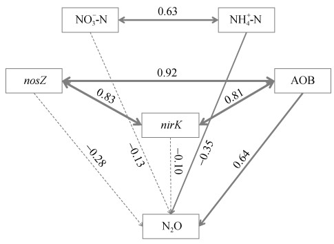 (路径旁边显示标准化的路径系数;实箭头和虚箭头分别表示P < 0.05和P > 0.05;箭头的宽度与路径系数的程度成正比;箭头上数值的正负分别表示正相关关系和负相关关系) 图 5 土壤理化因子和微生物丰度对N2O排放影响的结构方程模型 Fig. 5 Structural Equation Model for effects of soil physiochemical properties and microbial abundance on N2O emissions |