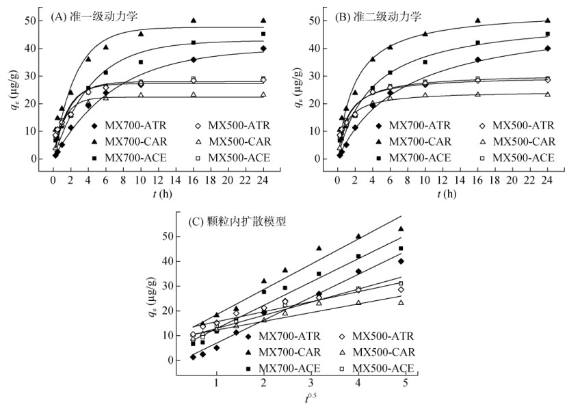 木屑生物质炭对农药的吸附量随时间的变化如图 1所示。采用准一级动力学方程、准二级动力学方程、颗粒内扩散方程对吸附结果进行拟合。从图 1可得,木屑生物质炭对农药的吸附过程可以分成3个阶段:快速吸附、缓慢吸附、吸附平衡。前4 h左右为快速吸附阶段,并且该阶段农药的去除率达整个过程的90% 左右;缓慢吸附阶段约持续到10 h,随后基本达到平衡。表面结合位点和传质驱动力是导致快速吸附过程的主要原因[19]。3种农药的吸附动力学过程基本相同,拟合参数如表 3所示。吸附平衡时,MX700对ATR、CAR、ACE的吸附量qe大于MX500,而MX700对3种复合农药ATR、CAR、ACE的吸附速率K1和K2均小于MX500,这可能是因为MX700具有更高的孔体积,农药在孔隙中需要更长的时间达到吸附平衡,总吸附容量也较大,而MX500的孔体积较小,农药能够较快地达到吸附平衡,导致吸附容量相对有限[13]。此外,MX700对ATR、CAR、ACE吸附的准二级动力学方程拟合参数(R2 = 0.998、0.970、0.987),高于准一级动力学方程拟合参数(R2 = 0.996、0.935、0.973)。类似地,MX500对ATR、CAR、ACE吸附的准二级动力学方程拟合参数(R2 = 0.963、0.975、0.950)也高于准一级动力学方程拟合参数(R2 = 0.811、0.943、0.911)。而且,准二级动力学方程计算出的理论值qe更加接近于试验测得的数据。因此,准二级动力学方程可以更准确地描述木屑生物质炭对水中复合农药ATR、CAR、ACE的吸附过程。准二级动力学方程假定了化学吸附是吸附过程的速率控制步骤[20],因此该吸附过程以化学吸附为主。这与生物质炭对单一农药的吸附特征类似,不同来源生物质炭对单一ATR、CAR和ACE的吸附均更符合准二级吸附动力学方程[20-22],因此,生物质炭对复合农药的动力学吸附规律可能与农药单体存在相似性和外推性。然而,本研究仅在3种农药单一浓度(100 µg/L)下开展研究,木屑生物质炭对其他浓度复合农药的吸附规律是否与农药单体一致,是否会存在竞争吸附还有待进一步研究。