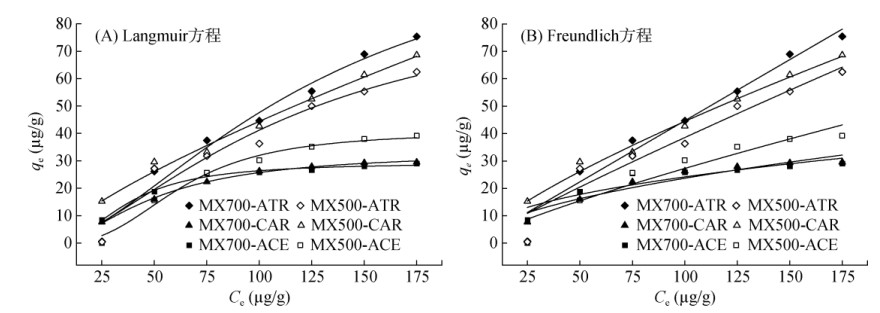 为了进一步分析ATR、CAR、ACE在木屑生物质炭中的扩散过程,采用颗粒内扩散方程进行模拟,结果如图 1C所示。颗粒内扩散方程也能较好地模拟不同温度制备木屑生物质炭对ATR、CAR、ACE的吸附,MX700和MX500的拟合参数分别为R2 =(0.954、0.975、0.963和0.914、0.935、0.954。而且,木屑生物质炭对混合农药ATR、CAR、ACE的吸附曲线为一条不通过原点的直线,说明颗粒内扩散不是控制吸附过程的唯一因素,而是由外部液膜扩散和颗粒内扩散联合控制[23]。