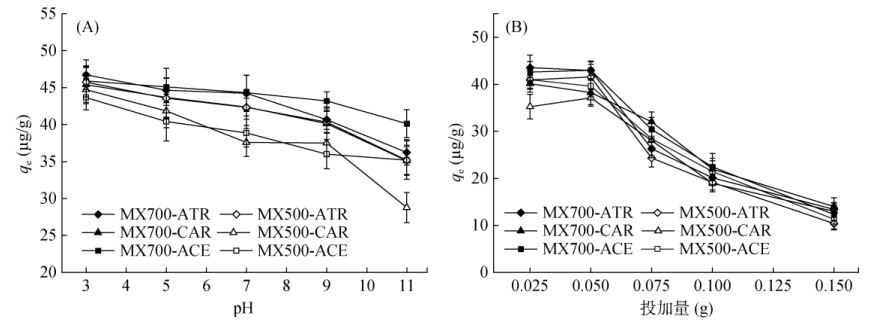 木屑生物质炭投加量对ATR、CAR、ACE的吸附效果如图 3B所示。随着生物质炭投加量增加,不同温度木屑生物质炭对3种农药吸附能力下降。添加0.05 g(2.0 g/L)时,MX700、MX500对于3种农药的吸附量均接近最大值,其中MX500对ATR、CAR、ACE吸附量分别为41.6、37.1、39.6 µg/g,MX700对ATR、CAR、ACE吸附量分别为43.0、38.3、42.9 µg/g。提高生物质炭投加量能增加生物质炭和水溶液中农药相互作用的吸附位点,从而增加生物质炭的吸附量。然而超过2.0 g/L投加量后,生物质炭吸附能力下降,可能是因为生物质炭过量容易导致吸附位点产生聚集,覆盖了表面部分吸附位点[19]。