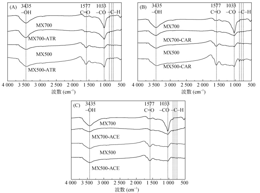 2.4 生物质炭吸附水溶液中ATR、CAR、ACE前后的FTIRMX700和MX500吸附3种农药前后的FTIR如图 4所示。把MX700和MX500吸附同一种农药的FTIR谱图叠放在一起比较可以看出,它们的谱图非常相似,其生物质炭含氧官能团的特征吸收峰的位置基本相同,表明其表面基团种类大致相同,但是特征吸收峰的数量存在差异,说明不同温度裂解的生物质炭含有的官能团的丰富程度不同。木屑生物质炭在波数为3 435 cm–1处的吸收峰主要是分子间氢键缔合的醇、酚的–OH伸缩振动产生的[22]。双键伸缩振动区1 600 ~ 1 750 cm–1之间的吸收峰为C=O和芳香环C=C的骨架伸缩振动产生[22]。波数约为1 000 ~ 1 600 cm–1处的振动带表明木屑生物质炭中含有C=O、C=C、C–O、C–H键[22]。波数约为1 000 ~ 650 cm–1处的振动带表明存在芳香族C–H键[25]。可见,MX700和MX500上主要的含氧官能团均为–OH、C=O、–COOH,且相比MX500,MX700主要在3 435 cm−1的–OH和1 033 cm−1的羧基中C–O所在峰的峰强有显著增加,表明高温使得木屑生物质炭表面的含氧官能团酚羟基和羧基数量增多。