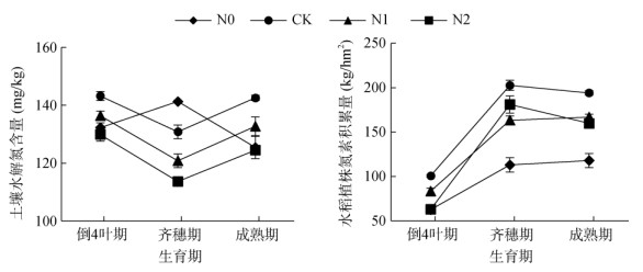 由图1可见,N1、N2和CK处理的土壤水解氮含量的变化规律相同,均表现为在倒4叶期和成熟期高、齐穗期低,N0处理则表现出相反规律。3个时期各施肥处理的土壤水解氮含量均表现为CK>N1> N2,N0处理在倒4叶期和成熟期土壤水解氮含量与N2处理相近,但在齐穗期明显高于其他处理。齐穗期和成熟期植株氮素积累量明显高于倒4叶期,倒4叶期和成熟期各处理植株氮素积累量为CK>N1> N2>N0,齐穗期为CK>N2>N1>N0。这是由于在倒4叶期N0和N1处理没施分蘖氮肥,导致土壤水解氮含量和植株氮素积累量相对较低;齐穗期由于施氮处理水稻植株对氮素的吸收量大于N0处理,使得土壤水解氮表现出降低趋势,而N0处理表现出增加趋势;成熟期由于水稻对氮素吸收能力的降低和施肥处理氮素的残留,使得施肥处理土壤水解氮含量回升,而N0处理没有氮肥的补充,土壤水解氮含量表现出下降。