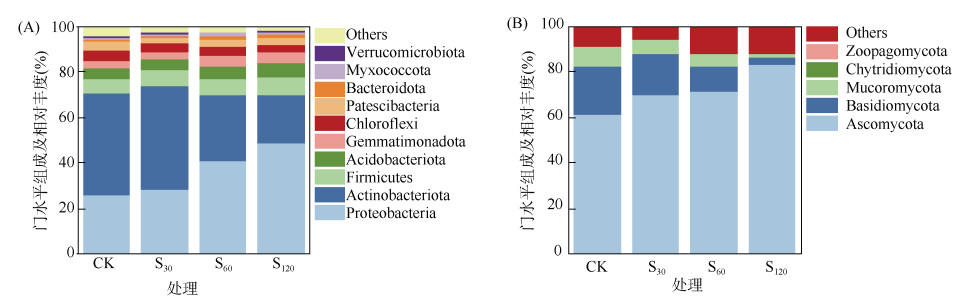 在细菌门水平上(图 1A),土壤中丰度较高的细菌群落为变形菌门(Proteobacteria)、放线菌门(Actinobacteriota)、厚壁菌门(Firmicutes)、嗜酸菌门(Acidobacteriota)、芽单胞菌门(Gemmatimonadota)和绿弯菌门(Chloroflexi)。与CK处理相比,S60和S120处理显著增加了变形菌门的相对丰度(P < 0.05),分别提高了55.3% 和85.9%,同时还增加了厚壁菌门、嗜酸菌门和芽单胞菌门的相对丰度,但差异未达显著水平;显著降低了放线菌门的相对丰度(P < 0.05),分别降低了35.2% 和52.3%(P < 0.05)。在真菌门水平上(图 1B),子囊菌门(Ascomycota)、担子菌门(Basidiomycota)、毛霉菌门(Mucoromycota)、壶菌门(Chytridiomycota)和Zoopagomycota是土壤中丰度较高的真菌群落,相对丰度为71.8%、13.5%、5.3%、0.1% 和0.1%。相较于CK处理,S30、S60和S120处理均显著增加了子囊菌门的相对丰度,分别提高了14.3%、16.7% 和35.1%,且S120处理与S30和S60处理的差异达显著水平(P < 0.05)。