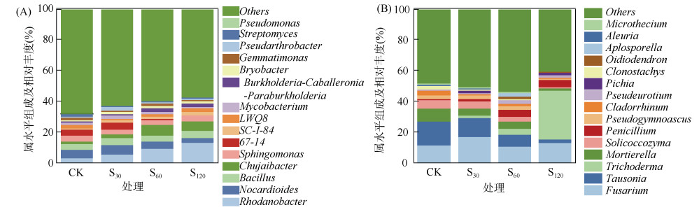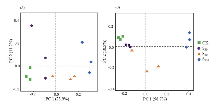 细菌群落主坐标分析(PCoA)结果表明,提取两个主成分的方差累积贡献率为35.1%(图 3A)。在PC1轴上,S30与CK处理聚在一起,而S60和S120处理与CK处理明显分离,说明S30与CK处理细菌群落结构相似,而S60和S120处理与CK处理的细菌群落结构差异较大。真菌群落PcoA分析显示,PC1和PC2的累积贡献率为69.2%(图 3B),在PC1轴上,S30与CK处理聚集在一起,而S60和S120处理与CK明显分离,亦说明S30与CK处理真菌群落结构相似,而S60和S120处理与CK处理的真菌群落结构差异较大。
