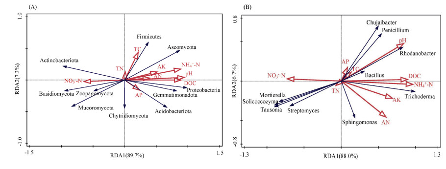 以土壤基本性质指标为解释变量,以优势菌门和属的相对丰度为响应变量进行冗余分析(RDA)。结果表明,在门水平上,两个主轴的特征值分别为89.7% 和7.3%(图 4A)。各优势菌门对环境因子的敏感性不同,主要受土壤pH和NH4+-N含量的影响,土壤pH与变形菌门(Proteobacteria)、厚壁菌门(Firmicutes)、嗜酸菌门(Acidobacteriota)、芽单胞菌门(Gemmatimonadota)和子囊菌门(Ascomycota)相对丰度呈正相关关系,与放线菌门(Actinobacteriota)相对丰度呈负相关关系。此外,变形菌门、厚壁菌门、嗜酸菌门、芽单胞菌门和子囊菌门相对丰度与DOC、AK、AN和NH4+-N含量均呈正相关关系,与NO3–-N含量呈负相关关系;放线菌门相对丰度与DOC、AK、AN和NH4+-N含量呈负相关关系,与NO3–-N含量呈正相关关系。在属水平上,两个主轴的特征值分别为88.0% 和6.7%(图 4B),土壤NH4+-N含量和pH是影响其群落结构变化的关键因子。罗丹杆菌属(Rhodanobacter)和木霉菌属(Trichoderma)相对丰度与pH、DOC和NH4+-N含量呈正相关,与NO3–-N含量呈负相关;链霉菌属(Streptomyces)相对丰度与pH、DOC和NH4+-N含量呈负相关,与NO3–-N含量呈正相关。