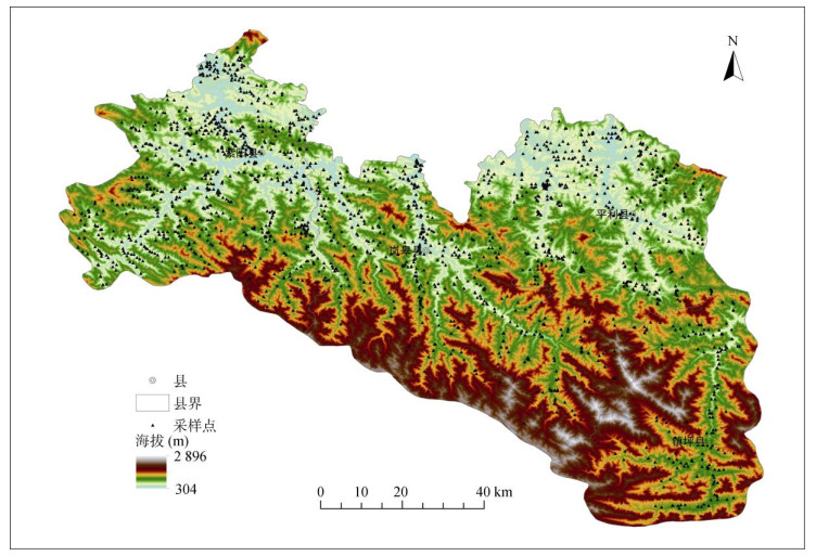 1.2 研究方法本研究采用典型结合随机方法完成土壤样品采集,用区域布点法(1 km2采集混合土样1份)在坡度较小、土层较厚的农田和园地采样,在坡度大、海拔较高的林地随机采样,采样点分布见图 1。每份土壤样品采用梅花布点法采集混合样,在采样点中心及四周10 m范围取5个小样(0 ~ 20 cm土壤),充分混合后按照四分法取300 ~ 500 g,共采集土壤样品2 101份。土样于室内晾干后研磨过筛至100目待测。