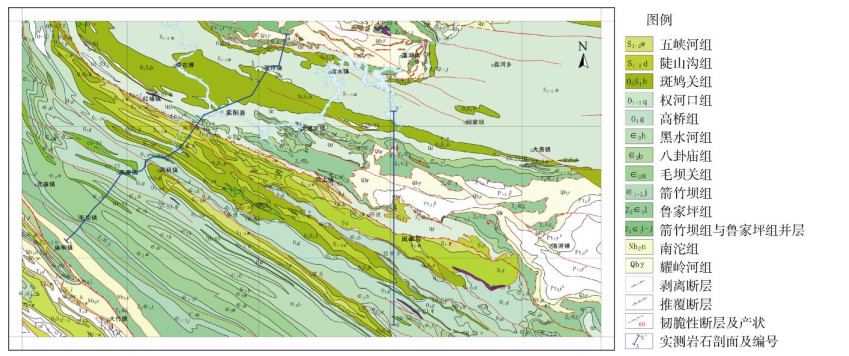 研究区大地构造隶属于秦岭褶皱系北大巴山加里东褶皱带,红椿坝–曾家坝断裂带将其分为紫阳–平利褶皱束和高滩–兵房街褶皱束两个构造单元,主要分布和发育着晚前寒武纪耀岭河群、埃迪卡拉纪和早古生代地层,由于受褶曲和断层影响,地层具有明显多旋回发展的特征,不同时期地层沿北西—南东向(NW—SE)呈条状多次重复出现,以火山碎屑岩、海相细碎屑岩、碳硅板岩和碳酸盐类为主,夹有多层碳质岩和石煤。海、陆相碎屑沉积物,河湖相松散沉积物及火山侵入体等甚至可以在微地域内交错共存,土壤母质复杂多变。
