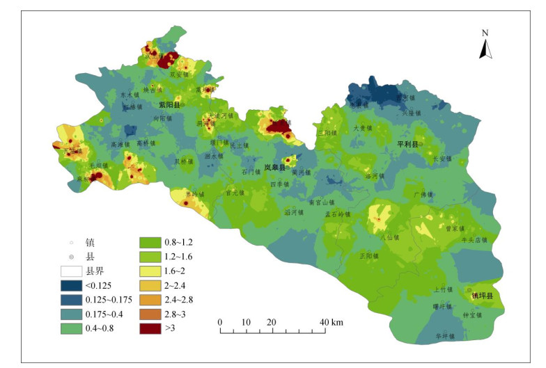 土壤硒含量分布大体呈现出两条NW—SE向的高硒带,北部从紫阳县汉王镇、双安镇、焕古镇、蒿坪镇、城关镇、洞河镇到岚皋县大道河镇、佐龙镇、城关镇延伸到平利县三阳镇、大贵镇、洛河镇、城关镇;南部从紫阳县瓦庙镇、毛坝镇、麻柳镇、高滩镇、界岭镇到岚皋县官元镇、孟石岭镇延伸到平利县八仙镇、镇坪县曾家镇、城关镇。硒过剩区域也主要分布在这两条高硒带上,面积达到75.79 km2,呈斑块、斑点状分布于紫阳县的双安镇、汉王镇、焕古镇、洞河镇、蒿坪镇、瓦庙镇、麻柳镇、毛坝镇、高滩镇、界岭镇,岚皋县佐龙镇、城关镇,镇坪县城关镇,其中紫阳县双安镇、汉王镇、焕古镇交界处,麻柳镇,岚皋县佐龙镇硒过剩土壤分布集中、面积较大。硒缺乏土壤主要分布于平利县北部西河镇、老县镇。