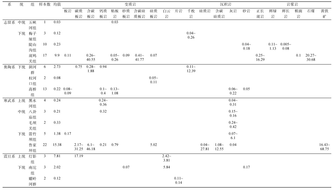 研究区不同地层时代岩石硒含量结果(表 2)表明,寒武系岩石硒含量均值最高9.65 mg/kg,志留系硒含量5.51 mg/kg,震旦系硒含量3.72 mg/kg,奥陶系硒含量0.92 mg/kg;不同岩组平均硒含量从大到小依次为:鲁家坪组、斑鸠关组、灯影组、洞河群、南沱组、箭竹坝组、毛坝关组、黑水河组、陡山沟组、高桥组、八卦庙组、耀岭河群、梅子垭组、权河口组、五侠河组,其中震旦系上统灯影组、寒武系下统鲁家坪组和志留系下统斑鸠关组岩石硒含量均值明显高于其他组岩石。