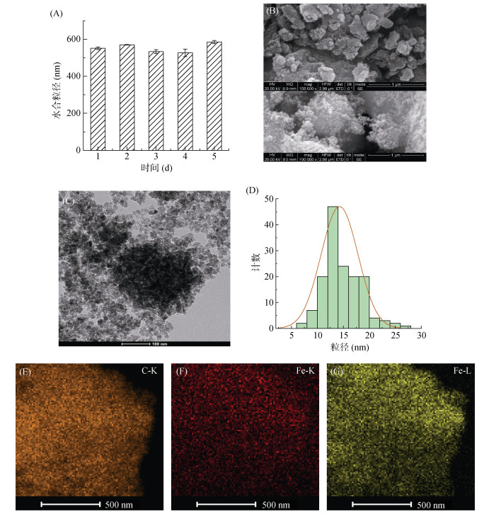 2 结果与讨论 2.1 铁碳纳米材料的制备与表征采用球磨法制备铁碳纳米材料(Fe-C),根据预试验优化了球磨的参数,试验中球磨转速120 r/min,正转5 min停2 min,反转5 min停2 min,运行120 h,每隔24 h取样进行检测,球料比为2.3,对不同时间制备的材料进行表征,结果如图 1所示。图 1A为不同球磨时间材料颗粒的水合粒径变化,可以看出,球磨1 d后材料的水合粒径可达550 nm,随着球磨时间的延长,水合粒径变化不显著,水合粒径较大的原因主要是颗粒的团聚导致的。图 1B和图 1C是球磨所得材料的扫描电镜(SEM)和透射电镜(TEM)图片,可以看出,材料呈片状或球状,在大颗粒表面附着大量细小纳米颗粒,利用TEM的粒径分布分析发现(图 1D),碳材料表面分布粒径为15 nm左右的纳米颗粒,结合图 1E元素分布图中C元素的K线、Fe元素的K线和Fe元素的L线可以看出,所制备的材料中铁(Fe)、碳(C)分布均匀。以上结果表明,通过球磨法成功制备了Fe-C。