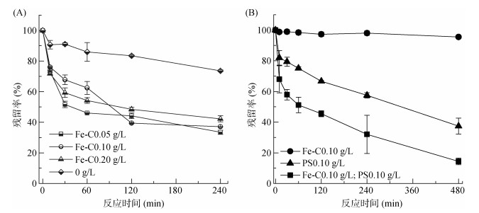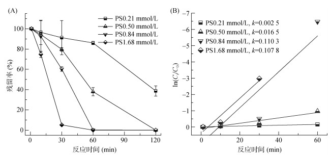Fe-C活化PS降解对羟基联苯的效果如图 2所示。从图 2可以看出,对羟基联苯的降解效率随着PS的浓度增大而逐渐增加,当PS的浓度为0.21 mmol/L时,对羟基联苯在120 min内降解率可达60%,继续增加PS的浓度至0.50 mmol/L时,污染物在120 min内基本能够被完全降解。对羟基联苯的降解动力学能够很好地用准一级动力学方程拟合(图 3B),随着PS的浓度从0.21 mmol/L增加至1.68 mmol/L,其降解的准一级动力学常数(k)也由0.002 5增加到0.016 5。以上结果说明,增加PS的浓度显著促进了对羟基联苯的降解速率,主要原因是随着氧化剂浓度的增加,反应体系中被Fe-C活化产生参与反应自由基的速率增加,所得到的活性物质越来越多,增加了各活性物质与污染物的接触,从而使得污染物降解的速率加快。