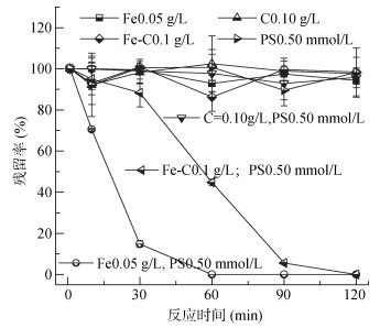 2.3 铁碳纳米材料活化过硫酸盐活性与纳米铁粉的对比通过上述试验对Fe-C和PS剂量的优化,发现在对羟基联苯初始浓度10 mg/L条件下,Fe-C的投加量为0.10 g/L、PS浓度为0.50 mmol/L时,Fe-C和PS使用量最少且降解效果良好。水溶液中作为对照,在相同试验条件下,对比了单独碳材料(C)、纳米铁粉(Fe)活化PS降解对羟基联苯的效果,结果如图 4所示。按照Fe-C中Fe含量为50.23% 的比例,单独纳米铁粉的用量为0.05 g/L时,可以看出,纳米铁粉同样具有高效活化过PS降解对羟基联苯的能力,120 min能将对羟基联苯彻底降解,说明纳米铁粉也能够高效活化过PS降解对羟基联苯。但在实际的土壤修复应用中,商业纳米铁粉的价格(1 000元/kg)要远高于本研究的Fe-C(10元/kg),而碳材料的引入会增加纳米铁材料在土壤中的迁移和增加其在土壤复杂体系中的活性。