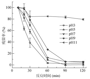 在活化过硫酸盐降解有机污染物的过程中,反应体系的pH对污染物的降解影响较大,因此本研究考察了不同pH下Fe-C活化PS降解对羟基联苯的效果,结果如图 5所示。由图 5可以看出,初始pH在3 ~ 9范围内,对羟基联苯都能够被很好地降解,降解率都在94.1% 以上。总体来说,随着pH下降,对羟基联苯的降解速率逐渐增大,主要原因是在低pH时,Fe-C中的铁会被逐渐溶解,溶出的二价铁离子能够促进PS的活化,从而增加了污染物的降解效率;当pH为11时,对羟基联苯仅降解了20.5%,这是因为在pH升至11时,溶液呈絮凝状,溶液中的铁离子被沉淀,导致反应被抑制。