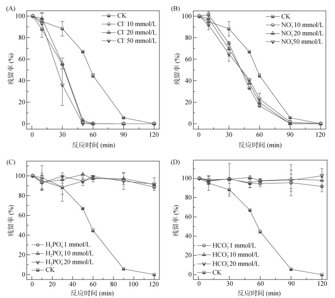 本研究发现,环境中存在的阴离子(Cl–、NO3–、H2PO4–、HCO3–等)会对活化PS中的自由基有着猝灭作用,从而抑制污染物的降解,结果如图 6所示。Cl–的加入显著促进了对羟基联苯的降解(图 6A),主要原因可能是加入的Cl–可以与体系中的·OH和SO4·–反应生成含氯的活性自由基。虽然所生成的含氯自由基的氧化还原电位比·OH和SO4·–低,却能够与对羟基联苯发生反应,从而促进其降解,相关反应式如下[28-30]: