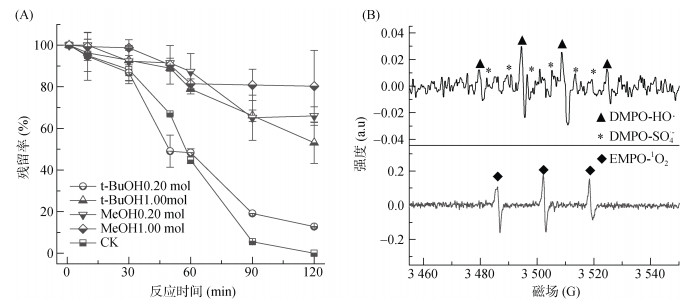 图 7 自由基猝灭剂对对羟基联苯降解的影响(A)及Fe-C活化PS体系中EPR图谱(B) Fig. 7 Effect of free radical quencher on degradation of p-hydroxybiphenyl(A)and EPR spectrum of activated PS system with iron-carbon nanomaterials(B) |