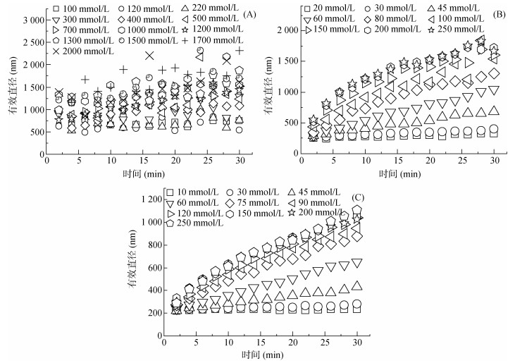 (A. 褐土碳酸钙结核胶体;B. 褐土碳酸钙结核纳米颗粒;C. 工业纳米碳酸钙) 图 5 三种碳酸钙胶体在CaCl2溶液凝聚动力学曲线 Fig. 5 Aggregation curves of three calcium carbonate colloids in CaCl2 solution |