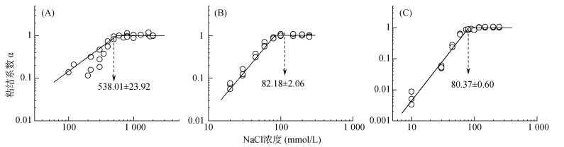 (A. 褐土碳酸钙结核胶体;B. 褐土碳酸钙结核纳米颗粒;C. 工业纳米碳酸钙) 图 6 三种碳酸钙胶体在NaCl溶液中的临界聚沉浓度值 Fig. 6 Critical coagulation concentrations of three calcium carbonate colloids in NaCl solution |