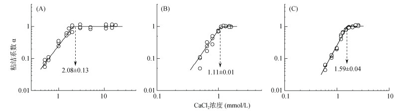 (A. 褐土碳酸钙结核胶体;B. 褐土碳酸钙结核纳米颗粒;C. 工业纳米碳酸钙) 图 7 三种碳酸钙胶体在CaCl2溶液中的临界聚沉浓度值 Fig. 7 Critical coagulation concentrations of three calcium carbonate colloids in CaCl2 solution |