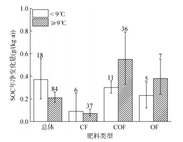 2.2 影响施肥固碳作用的因素 2.2.1 气候因素年均气温对施肥固碳效果的影响见图 2。由图 2可知,对于年均气温 < 9 ℃和≥9 ℃的情况,施肥处理总体均显著增加农田SOC含量,变化率分别达到0.37和0.21 g/(kg·a)。分析CF、COF和OF各种施肥处理组内不同温度亚组间的情况发现,均不具有显著差异;分析3种施肥处理组在年均温度≥9 ℃下的情况得出,CF组的SOC含量变化率最低(0.07 g/(kg·a)),且与COF组和OF组都具有显著差异,而COF与OF组间差异不显著。