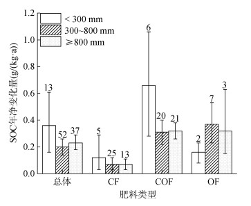 年均降水量对施肥固碳效果的影响见图 3。由图 3可知,对于年均降水量为211 ~ 300、≥300 ~ 800和≥800 ~ 1 727 mm的情况,施肥处理总体均能显著增加农田SOC含量,变化率分别为0.36、0.20和0.23 g/(kg·a),但不同降雨量之间不具有显著差异。同时,CF、COF和OF各施肥处理组内不同降水量之间也不具有显著差异;对于年均降水量为≥300 ~ 800和≥800 ~ 1 727 mm两种情况下,CF和COF、OF分别差异显著,而COF和OF间差异不显著。