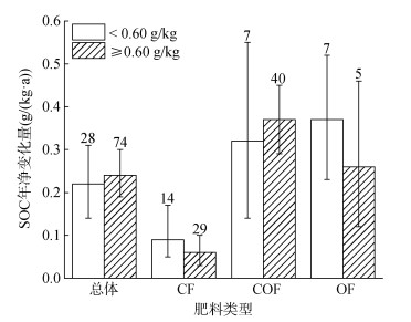 从图 5可知,对于施肥处理总体,农田初始TN含量 < 0.60 g/kg和≥0.60 g/kg两种情况下,施肥处理的SOC含量变化率分别为0.22和0.24 g/(kg·a),但两者间差异不显著。当农田初始TN含量 < 0.60 g/kg时,CF、COF和OF处理对农田SOC含量变化率分别为0.09、0.32和0.37 g/(kg·a),其中CF与OF处理差异显著;当农田初始TN含量≥0.60 g/kg时,CF、COF和OF处理SOC含量变化率分别为0.06、0.37和0.26 g/(kg·a),其中CF与COF处理差异显著。