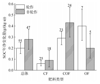 2.2.3 轮作制度不同轮作制度下,施肥对土壤有机碳固定的影响如图 6所示。从图 6可知,对于作物轮作和非轮作两种轮作制度,施肥处理总体上SOC含量变化率分别为0.20和0.28 g/(kg·a),但二者差异不显著。对于不同施肥处理组,在作物轮作条件下,OF、CF和COF处理均显著增加农田SOC含量,其中OF处理的SOC含量变化率(0.40 g/(kg·a))相比CF处理的(0.06 g/(kg·a))显著较高;而在非作物轮作条件下,CF、COF和OF处理下农田SOC含量变化率分别为0.09、0.43和0.20 g/(kg·a),其中,CF与COF差异显著,而COF和OF之间差异不显著。