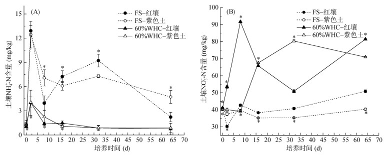 2 结果与分析 2.1 土壤铵态氮和硝态氮含量红壤和紫色土在FS和60%WHC条件下土壤NH4+-N和NO3–-N含量随培养时间的变化存在显著差异。如图 1A所示,无论是红壤还是紫色土,FS培养的土壤NH4+-N含量均高于60%WHC。FS培养下,红壤和紫色土的NH4+-N含量均在第2天时达到最大值,分别为12.91和12.44 mg/kg;随着培养时间的增加,土壤NH4+-N含量均呈下降趋势,在培养第64天,紫色土NH4+-N含量较红壤明显增加了2.49 mg/kg (P < 0.05)。60%WHC培养下,土壤NH4+-N含量随着培养时间的增加呈先增加后减少并趋于稳定的变化趋势;在培养的前16天,紫色土NH4+-N含量较红壤显著提高了1.5% ~ 63.0%(P < 0.05)。总体上,FS培养的土壤NH4+-N含量明显高于60%WHC,且培养期内紫色土NH4+-N平均含量高于红壤。