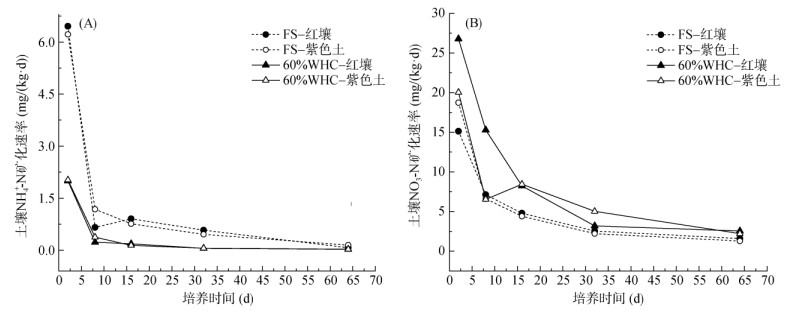2.2 土壤氨化速率和硝化速率如图 2所示,培养期内,土壤氨化和硝化速率均随培养时间呈先下降后平稳的变化趋势。对土壤NH4+-N而言(图 2A),FS培养的氨化速率(0.07 ~ 6.46 mg/(kg·d))明显高于60%WHC(0.02 ~ 2.03 mg/(kg·d));FS培养下,红壤氨化速率除在第8天和第64天低于紫色土外,其他培养时间内均高于紫色土;60%WHC培养下,除第16天外,紫色土氨化速率略高于红壤;总体上,整个培养时期内,紫色土平均氨化速率(0.52和1.75 mg/(kg·d))均高于红壤(0.50和1.73 mg/(kg·d))。对土壤NO3–-N而言(图 2B),FS培养的硝化速率均低于60%WHC,平均减少了27.2% ~ 79.8%;FS培养下,除第2天外,红壤硝化速率(1.59 ~ 7.13 mg/(kg·d))均高于紫色土(1.26 ~ 6.60 mg/(kg·d));60%WHC培养下,红壤硝化速率在培养前期(第16天之前)明显高于紫色土;总体上,60%WHC培养的土壤硝化速率高于FS,且红壤在60%WHC培养下的硝化速率明显高于紫色土。