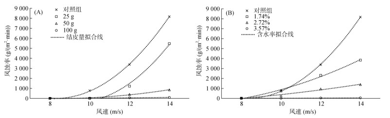 图 2 不同结皮量(A)与含水率(B)条件下风蚀率与风速关系 Fig. 2 Relationship between wind erosion rates and wind speeds under different crust quantities(A) and moistures(B) |
