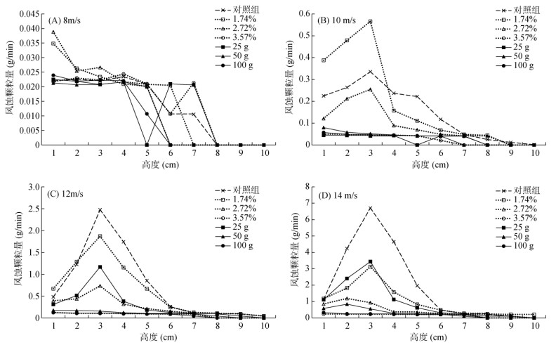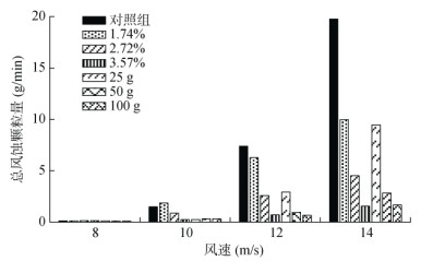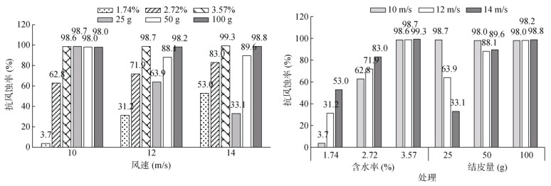 在结皮不被吹破的情况下,结皮的抗风蚀效果要优于含水率,因此,结皮抗风蚀效果与风速和结皮量有关,10 m/s以下风速任何结皮量均能有效抗风蚀,12 m/s需25 g以上结皮量,14 m/s需要50 g以上结皮量。而含水率在任何试验风速下需达到2.72% 以上才有较好的抗风蚀效果。