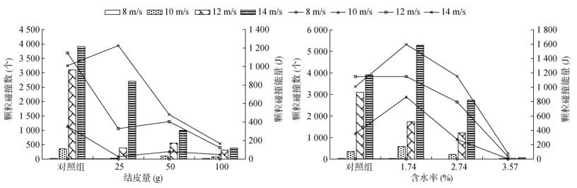 各试验组在吹蚀时间内的颗粒碰撞总数及能量如图 6所示,颗粒碰撞能量与数量同步变化。风速、含水率、结皮量变化均会对颗粒碰撞产生影响。风速越大,颗粒碰撞数及能量越大;除对照组外,含水率和结皮量越高,颗粒碰撞数及能量越小;与风速、含水率和结皮量对尾矿风蚀率、风蚀颗粒分布的规律一致。风速8 m/s试验组由于风速较小,结皮量100 g及含水率3.57% 试验组由于抗风蚀能力较强,风蚀颗粒释放较少,颗粒碰撞数和能量也较小。
