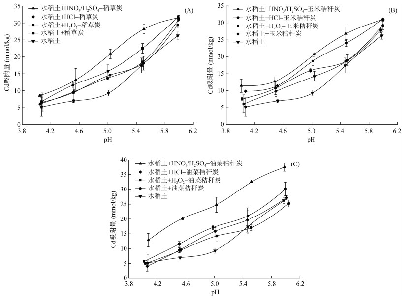 2.2 添加不同生物质炭对水稻土吸附Cd(Ⅱ)的影响吸附试验的结果表明(图 1),生物质炭的添加有效增加了安徽酸性水稻土对Cd的吸附量。与未改性生物质炭相比,添加H2O2改性生物质炭对水稻土Cd的吸附增加更多;与HCl处理的生物质炭相比,添加HNO3/H2SO4改性生物质炭对水稻土Cd的吸附增加更多。以pH 5.5为例,添加H2O2改性的稻草炭、玉米秸秆炭和油菜秸秆炭的水稻土对Cd的吸附量分别比添加稻草炭、玉米秸秆炭和油菜秸秆炭的水稻土增加了24.3%(图 1A)、27.0%(图 1B)和23.0%(图 1C)。类似地,添加HNO3/H2SO4改性的稻草炭、玉米秸秆炭和油菜秸秆炭的水稻土对Cd的吸附量分别比添加HCl处理的稻草炭、玉米秸秆炭和油菜秸秆炭的水稻土增加了52.6%(图 1A)、43.5%(图 1B)和65.5%(图 1C)。以上结果表明改性生物质炭对提升水稻土Cd吸附的效果更为显著。此外,同一pH条件下,添加HNO3/H2SO4改性生物质炭的水稻土对Cd的吸附量均高于添加H2O2改性生物质炭的水稻土。当pH为5.5时,添加HNO3/H2SO4改性的稻草炭、玉米秸秆炭和油菜秸秆炭的水稻土对Cd的吸附量分别是未添加生物质炭的对照组的1.62倍、1.54倍和1.87倍,而添加H2O2改性的稻草炭、玉米秸秆炭和油菜秸秆炭的水稻土对Cd的吸附量分别是未添加生物质炭的对照组的1.29倍、1.38倍和1.21倍。以上结果进一步说明添加H2O2改性和HNO3/H2SO4改性生物质炭均能有效提高酸性水稻土对重金属Cd的吸附,且HNO3/H2SO4改性生物质炭的提升效果更好。为了分析不同处理及不同pH对水稻土Cd吸附量的影响,进行多因素方差分析,结果见表 3。如表所示,不同处理和不同pH对水稻土Cd吸附量均有显著影响,两者之间的交互效应也达到显著,这有效验证了吸附试验的结果。