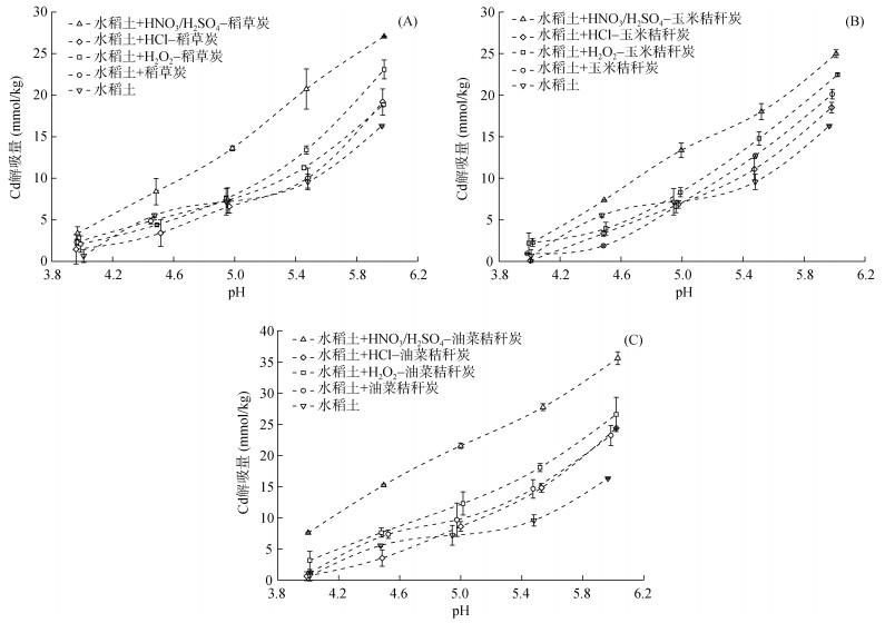 多项研究[31, 36-37]表明,生物质炭促进重金属在土壤表面的吸附机制主要有3个方面:①生物质炭通过增加土壤表面负电荷促进土壤对重金属的静电吸附;②生物质炭表面官能团与重金属离子络合促进了土壤对重金属的专性吸附;③生物质炭提高土壤pH促进重金属离子形成表面沉淀。本研究中,吸附试验所用的Cd(Ⅱ) 溶液以0.1 mol/L的NaCl作支持电解质,高浓度的钠盐抑制了土壤对Cd的静电吸附,因此本文中Cd的吸附机制主要涉及专性吸附和表面沉淀[30-31]。此外试验过程中以EDTA作为解吸剂,其解吸的Cd主要为土壤专性吸附的Cd[31]。解吸试验的结果表明(图 2),在pH 4.0 ~ 6.0的范围内,添加生物质炭的水稻土中Cd的解吸量基本高于未添加生物质炭的水稻土,解吸量的提高证明了生物质炭的添加促进了水稻土对Cd的专性吸附。与添加HCl处理的生物质炭的水稻土相比,添加HNO3/H2SO4改性生物质炭的水稻土中Cd的解吸量更大;而添加H2O2改性生物质炭的水稻土中Cd的解吸量略高于添加未改性生物质炭的水稻土。以上结果与改性前后生物质炭表面质子结合位点数的变化规律基本保持一致(表 2),说明了官能团的增加是改性生物质炭提升水稻土对Cd专性吸附的主要原因。随着pH升高,不同生物质炭处理的安徽酸性水稻土中Cd的解吸量均呈现一个增加的趋势,这可能是因为生物质炭表面羧基、羟基等官能团的离解度随pH的升高而增大,在较高的pH条件下这些官能团离解产生更多的有机阴离子,络合更多的重金属离子,从而增加了专性吸附[35, 38]。此外,对于同一物料制备的生物质炭在相同pH条件下,经HNO3/H2SO4改性的生物质炭对水稻土中Cd解吸量的增加最大。以pH 5.5为例,在添加了HNO3/H2SO4改性的稻草炭、玉米秸秆炭和油菜秸秆炭后,酸性水稻土中Cd的解吸量为20.74、18.02和27.74 mmol/kg,分别是不添加生物质炭的对照组的2.17倍、1.88倍和2.90倍。如表 2所示,HNO3/H2SO4改性显著增加了生物质炭表面羧基官能团数量,而专性吸附主要来自于生物质炭表面官能团与重金属离子的络合,因此将HNO3/H2SO4改性生物质炭添加到安徽酸性水稻土中,有效增强了土壤对Cd的专性吸附。多重方差分析的结果(表 3)反映了不同处理及不同pH对水稻土Cd解吸量的影响,与解吸试验的结果一致,不同处理和不同pH对水稻土Cd解吸量的影响显著,两者之间的交互效应也达到显著。