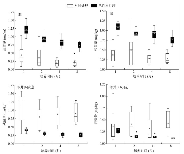 2 结果与讨论 2.1 土壤中PAHs残留量动态变化土壤中菲(3环)、芘(4环)、苯并[b]荧蒽(5环)、苯并[g, h, i]芘(6环)的残留量随培养时间变化如图 1所示。培养开始时各处理土壤中PAHs含量为2 mg/kg,培养1个月后,各处理土壤中PAHs残留量降低较快,对照处理土壤中菲、芘、苯并[b]荧蒽、苯并[g, h, i]芘分别降低了77.90%、81.32%、44.29%、82.04%,5% 活性炭处理土壤中分别降低了38.92%、45.89、79.31%、85.33%。此后,除对照处理土壤中苯并[g, h, i]芘残留量未降低外,其他处理中菲、芘、苯并[b]荧蒽、苯并[g, h, i]芘残留量均呈降低趋势。由图 1可见,培养到第8个月结束时,对照处理土壤中菲、芘、苯并[b]荧蒽残留量均值分别降低了58.07%、24.82%、18.08%,5% 活性炭处理土壤中菲、芘、苯并[b]荧蒽、苯并[g, h, i]芘残留量均值分别降低了39.30%、28.71%、36.43%、61.30%。整体而言,各处理土壤中PAHs含量在培养4个月后不再有明显变化,土壤中PAHs残留量逐渐稳定。