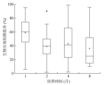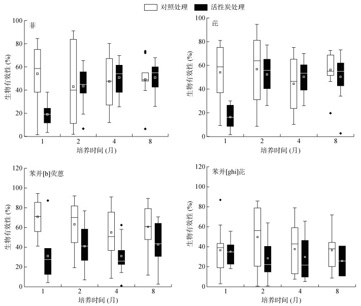 随着培养时间的延长,在对照处理土壤中PAHs有效性在培养开始前4个月内呈降低趋势,培养至第8个月时,土壤中菲、苯并[g, h, i]芘生物有效性逐渐趋于稳定,这主要归因于PAHs在土壤中的老化过程。研究表明,随着老化时间延长,土壤中PAHs与土壤有机质等组分结合更加密切,导致生物有效性降低[25]。而芘、苯并[b]荧蒽生物有效性略有升高,这也可能是由于随着老化时间的延长有部分PAHs解吸出来。在活性炭处理土壤中菲、芘、苯并[b]荧蒽随培养时间的延长生物有效性呈上升趋势,苯并[g, h, i]芘生物有效性随培养时间延长则趋于稳定。这是因为在培养开始阶段,活性炭可高效吸附PAHs,大幅度降低其生物有效性,但随时间延长这种吸附效果减弱,PAHs可进一步解吸出来进入土壤溶液,导致其生物有效性升高。该结果说明向土壤中添加活性炭来阻控PAHs降低其生物有效性并不是一劳永逸的。活性炭对PAHs的阻控效果会逐渐降低,在实际场地应用过程中应注意跟踪。图 3进一步证实了在1个月内活性炭对土壤中PAHs生物有效性的降低率是最高的,随着时间延长活性炭阻控效果减弱。