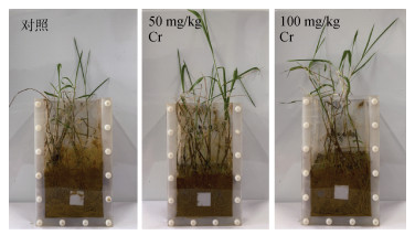以重铬酸钾(K2Cr2O7)溶液的形式向装有供试土壤的塑料桶中分别加入50 mg/kg和100 mg/kg的铬,搅拌均匀后装入对应的根箱,每个处理3个重复。同时以土壤中不添加铬的根箱作为对照,其他条件与铬处理相同。将所有根箱放入温室平衡2周,平衡期间每天给土壤浇去离子水,使土壤含水量保持在田间持水量的80% 左右。土壤平衡后测得铬处理土壤实际铬含量平均分别为59.2 mg/kg和113.8 mg/kg。土壤平衡结束后,每个根箱移栽入3株大小一致的李氏禾,种植间距为2 cm。移栽时注意使李氏禾根部尽量靠近可拆卸后板,移栽后将根箱倾斜45°使根部沿着后板生长。