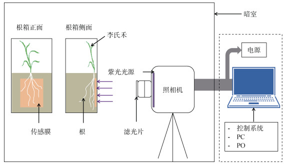植物移栽后置于温室培养一周,然后打开根箱可拆卸后板,将4 cm×4 cm的平面光极传感膜的敏感面朝向根系生长区域贴至可拆卸后板上,贴好传感膜后将膜与植物根系接触,同时确保膜与土壤颗粒紧密接触且无气泡产生。培养期间在根箱外部贴锡箔纸避光,贴膜位置见图 1。将膜–根系稳定24 h后,架设平面光极实验装置,开始用高分辨率数码相机拍摄根系泌氧荧光图像,每天下午16:00进行拍摄,连续拍摄8 d,装置示意图见图 2。将根箱放置于摄像头正前方,曝光时间为3 000 ms,使用可调节波长的氙灯光源采光,光源波长415 nm,同时在相机镜头前放置与中心波长相对应的滤光片。拍摄过程中,镜头距离平面光极传感膜30 cm,并且保证每天的观测距离相同,整个成像过程在暗室中完成。试验期间每日定时给每个根箱浇入适量去离子水以保证根箱内土壤含水量不变。拍摄完成后收获李氏禾,测量根长和株高。