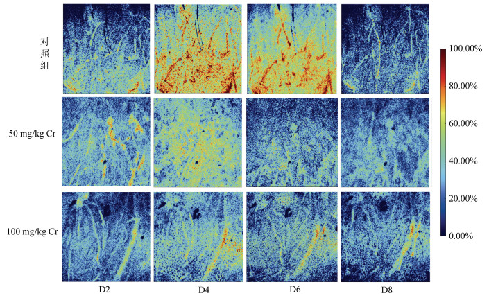 (图中D2、D4、D6、D8分别表示观测时间第2、4、6、8天;不同颜色代表了土壤中不同溶解氧浓度,其中0%为饱和无水亚硫酸钠溶液,100%为氧饱和水;下同) 图 3 不同铬处理下李氏禾根际溶解氧空间动态变化情况 Fig. 3 Temporal and spatial variation of O2 in rhizospheres of L. hexandra under different Cr treatments |